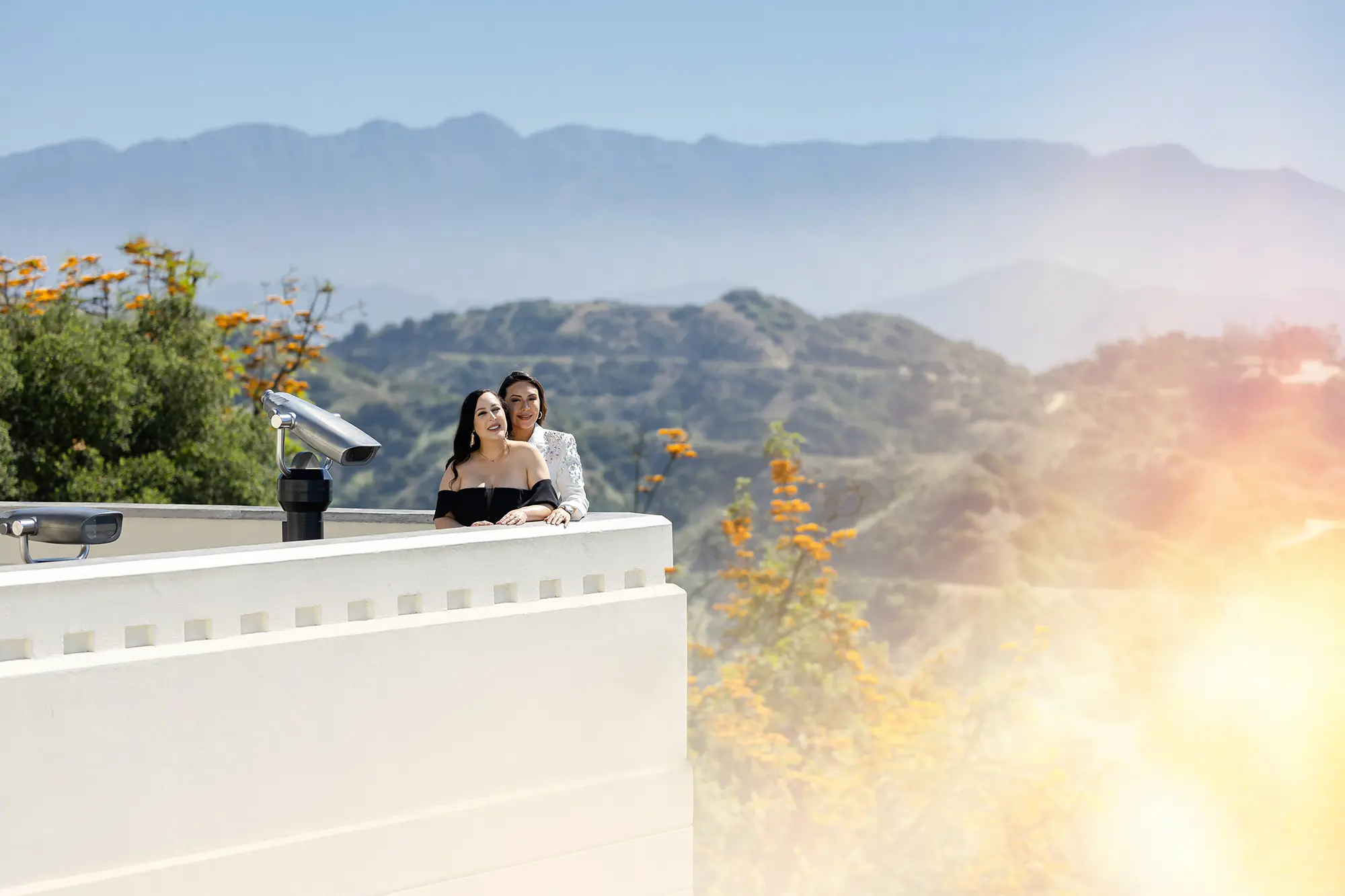 Soft neutrals like beige, white, light brown, rust, or dusty blue look amazing against the Observatory’s white Art Deco architecture and the warm tones of the surrounding hills.